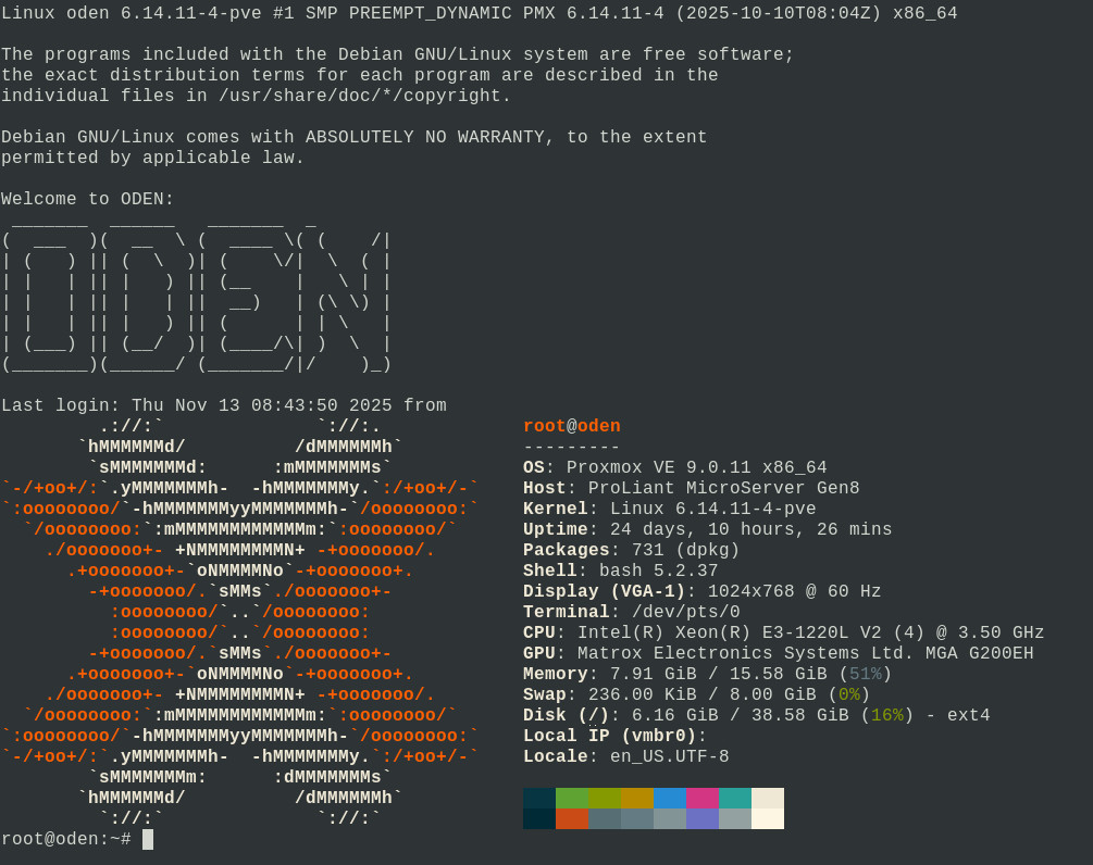 Using proxmox i used this simple method. Update your system and install fastfetch. sudo apt update && sudo apt upgrade -y && sudo apt install fastfetch Generate a banner here: http://www.network-science.de/ascii/ Edit: /etc/motd sudo nano /etc/motd Insert your ascii art: The programs included with the Debian GNU/Linux system are free software; the exact distribution terms for each program are described in the individual files in /usr/share/doc/*/copyright. Debian GNU/Linux comes with ABSOLUTELY NO WARRANTY, to the extent permitted by applicable law. Welcome to ODEN: _______ ______ _______ _ ( ___ )( __ \ ( ____ \( ( /| | ( )…